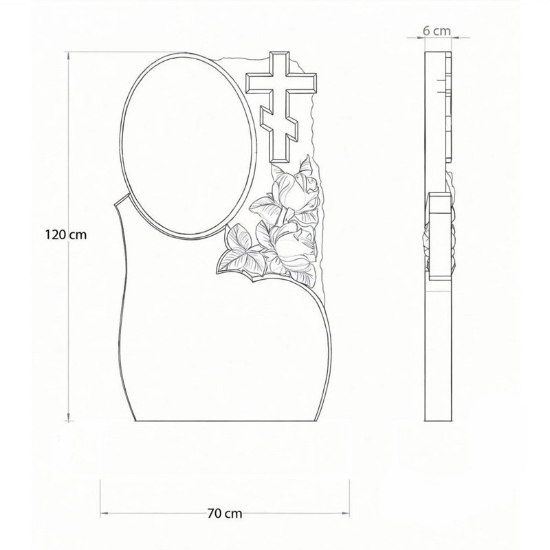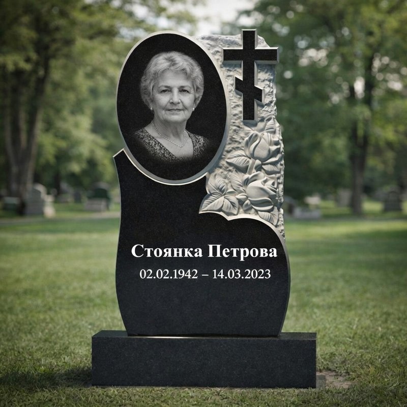 Представяме ви елегантен и изискан гранитен паметник от висококачествен черен гранит, съчетаващ модерна визия и традиционна православна символика. Моделът впечатлява с овална рамка за фотореалистичен портрет, релефна художествена композиция с цветя и изящен православен кръст.