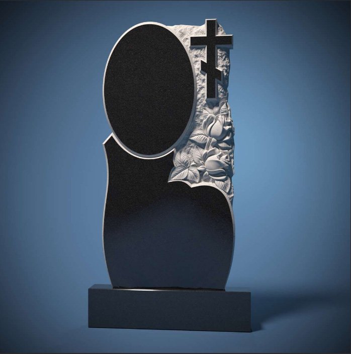 Комбинацията между огледално полирана черна повърхност и скулптурно изработен светъл декоративен елемент създава силен визуален контраст и подчертава индивидуалността на паметника.