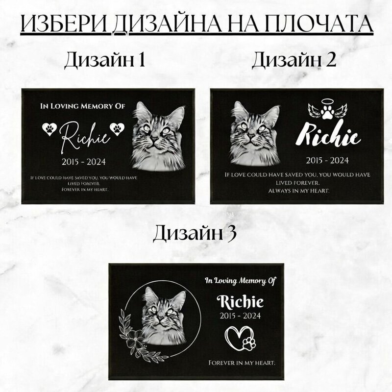 Възможно е пълно персонализиране – гравиране на име, години, кратка епитафия или символ, а при желание и портретна гравюра. Това превръща всяка плоча в уникален мемориал за куче или котка, съобразен с личната история и емоционалната стойност на спомена.