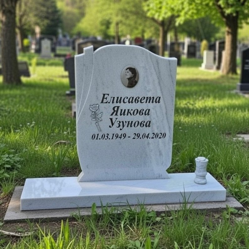 Стилен надгробен паметник от светъл мрамор, отличаващ се с изчистен дизайн, плавни форми и елегантно присъствие. Моделът е подходящ за единично гробно място и предлага балансирана визия, съчетаваща класическа изработка и дълготрайни материали.