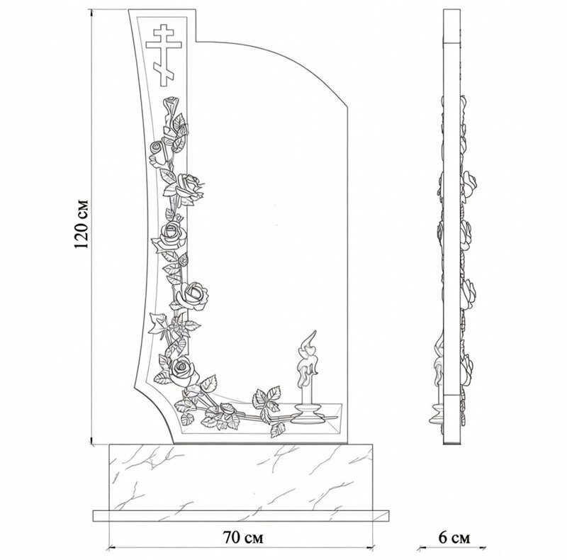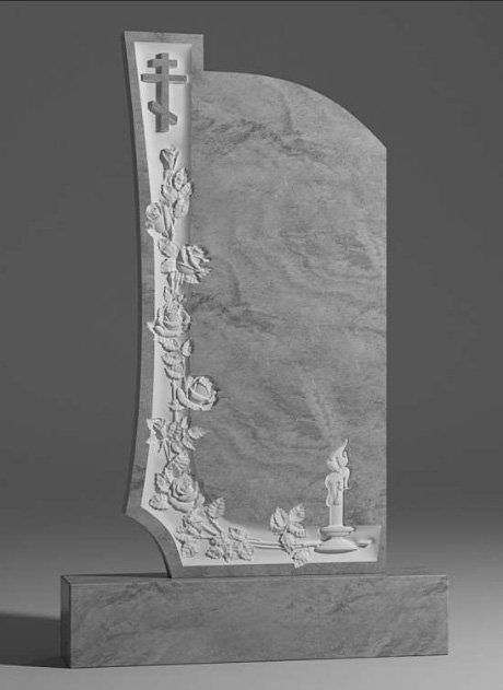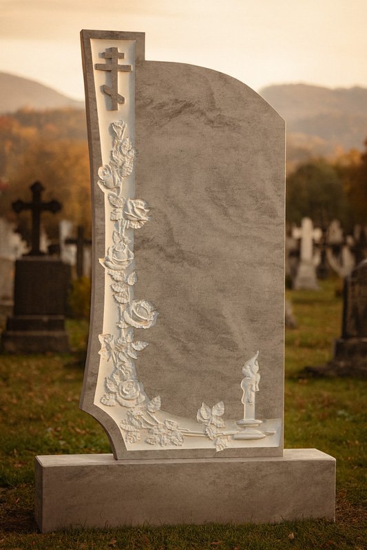 Мраморен надгробен паметник с рози, свещник и православен кръст – класически орнаментен дизайн