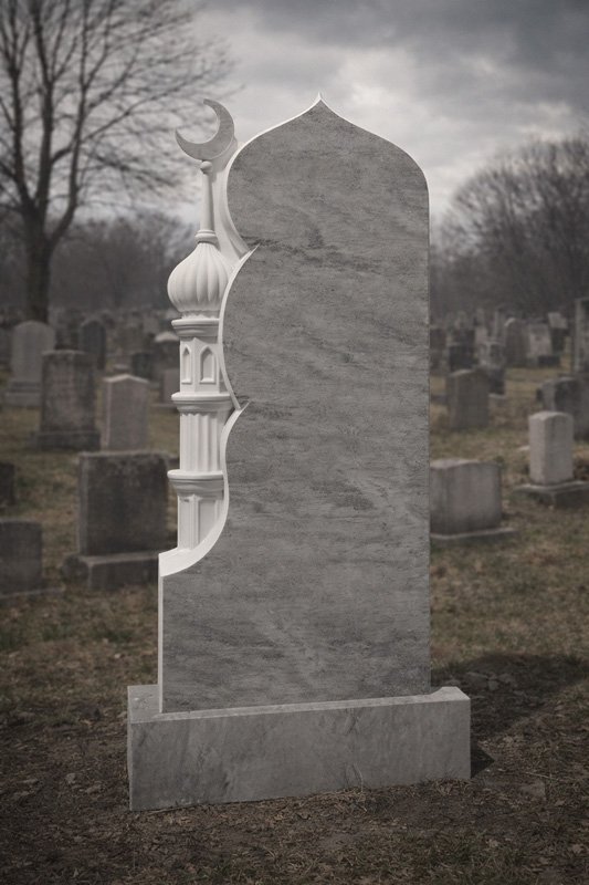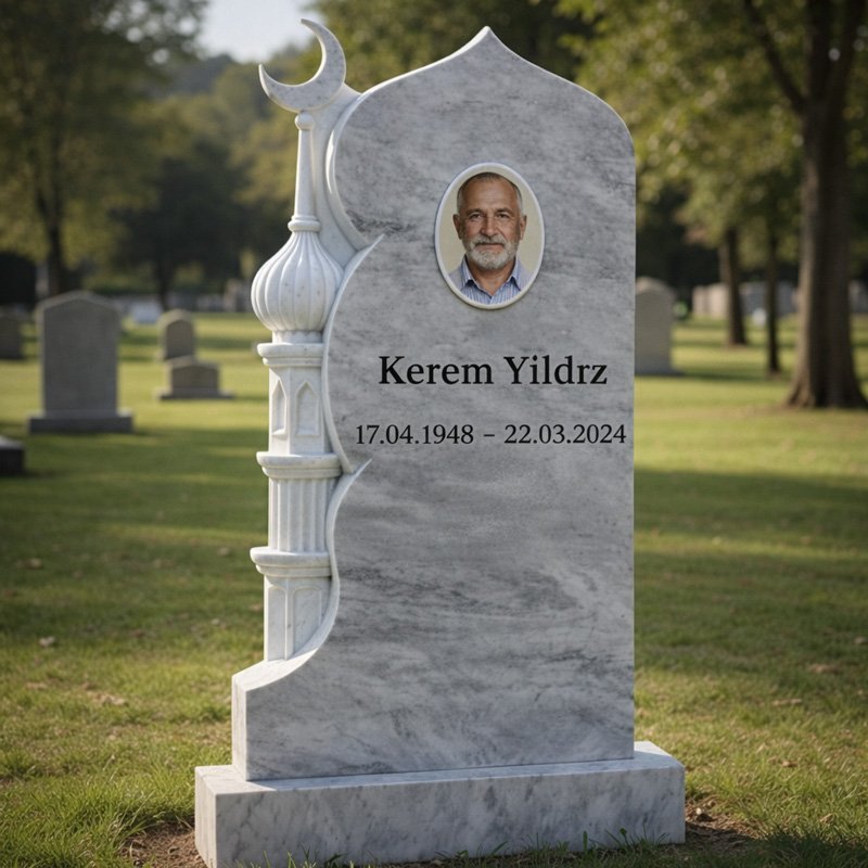 Елегантен мюсюлмански паметник от висококачествен естествен мрамор с изящен релеф на джамия и полумесец – символ на вяра, духовност и вечна памет. Моделът е изработен с модерна CNC технология за прецизна обработка и детайлност.