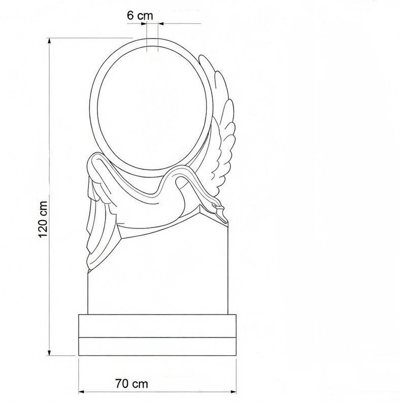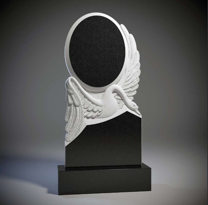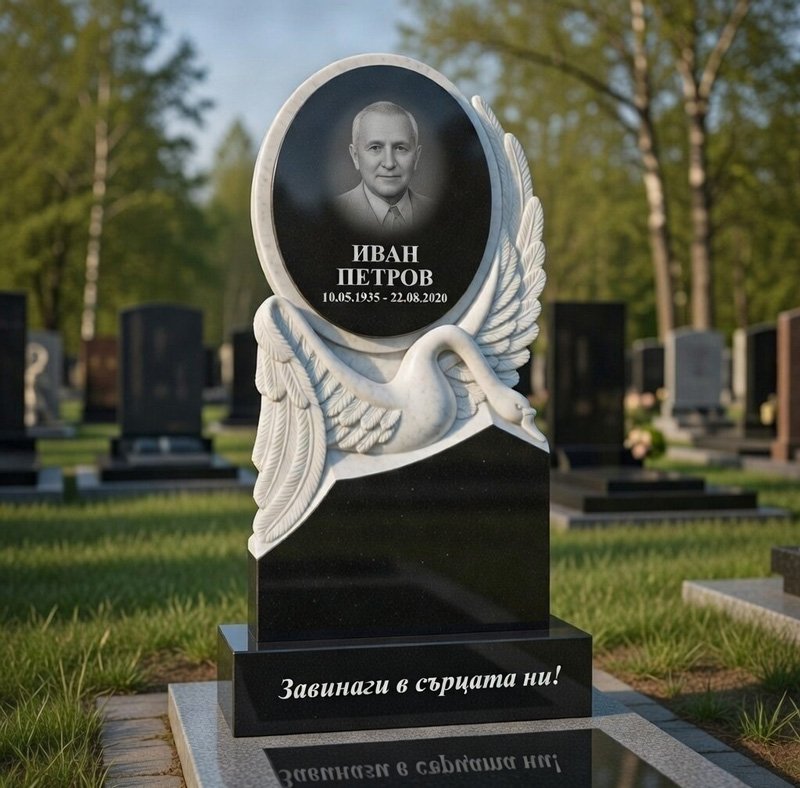 Монументален надгробен паметник от черен гранит с дълбок блясък и висока издръжливост. В горната част – елегантен релефен лебед с разперени криле, символ на дълъг живот, семейна обич, грижа и вечен покой. Централно място заема голям овален гравиран портрет с фина детайлност и дълготрайна четливост. Размери: височина 120 см, ширина 70 см, дебелина 6 см.Идеален избор за достоен и внушителен спомен – класически черен цвят, който подчертава сериозността и вечността.